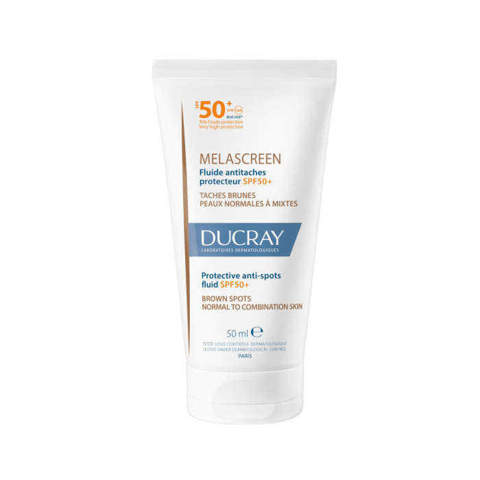 Melascreen Protective anti-spots fluid SPF50+ minskar hudens pigmentförändringar, skyddar och förhindrar att nya pigmentförändringar uppstår.