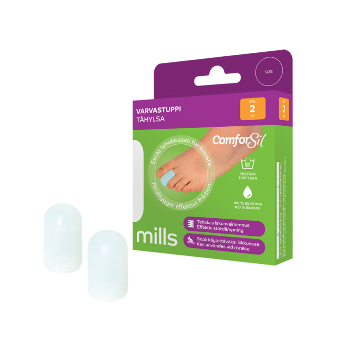 Den förstärkta udden på tåhylsan i silikon dämpar effektivt trycket mot tåspetsen och lindrar den smärta som belastningen orsakar. Förebygger skavsår, liktornar och nagelskador på tåspetsen. Skyddar tånageln och spetsen på en krokig tå. Lämpar sig för användning också på fingerspetsar. Användning av talk rekommenderas i samband med produkten